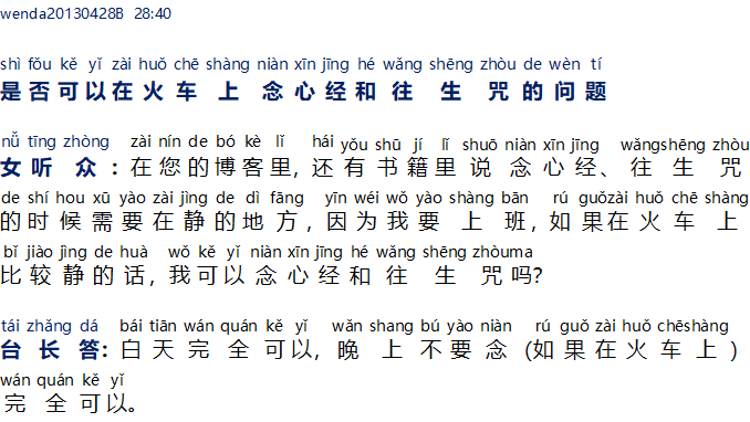 wenda20130428B 28:40 – Pertanyaan tentang apakah boleh melafalkan paritta Xin Jing dan Wang Sheng Zhou di dalam kereta?