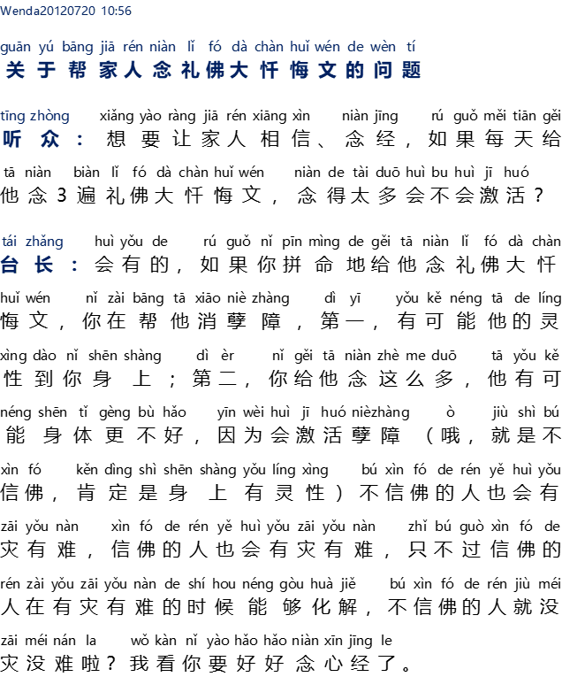 Pertanyaan tentang membantu anggota keluarga melafalkan Lǐ Fó Dà Chàn Huǐ Wén 关于帮家人念礼佛大忏悔文的问题