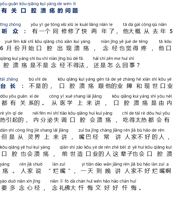 Master: Bukan, sariawan berhubungan dengan karma buruk dan karma ucapan yang dilakukannya di kehidupan sekarang ini. Dari segi medis, penyakit sariawan disebabkan oleh panas dalam, gangguan endokrin atau memakan makanan yang memicu panas dalam juga bisa mengakibatkan sariawan. Tetapi dari segi dunia roh, orang yang mengatakan keburukan orang lain, mulutnya juga akan sariawan. Orang yang membuat karma ucapan di kehidupan lampau juga akan mengalami sariawan di kehidupan ini. Ada istilah “mulut busuk”, selalu mengatakan keburukan orang lain, mulutnya busuk. Mesti perbanyak melafalkan paritta Xin Jing dan Li Fo Da Chan Hui Wen untuk bertobat dengan sungguh-sungguh.