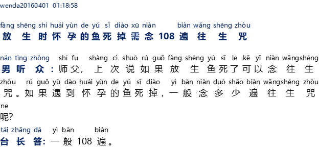 Pendengar pria : Master, kemarin Master ada mengatakan bahwa jika ikan yang dilepaskan itu mati, kita boleh melafalkan mantra Wang Sheng Zhou. Jika ikan yang hamil mati, umumnya harus melafalkan berapa kali Mantra Wang Sheng Zhou?