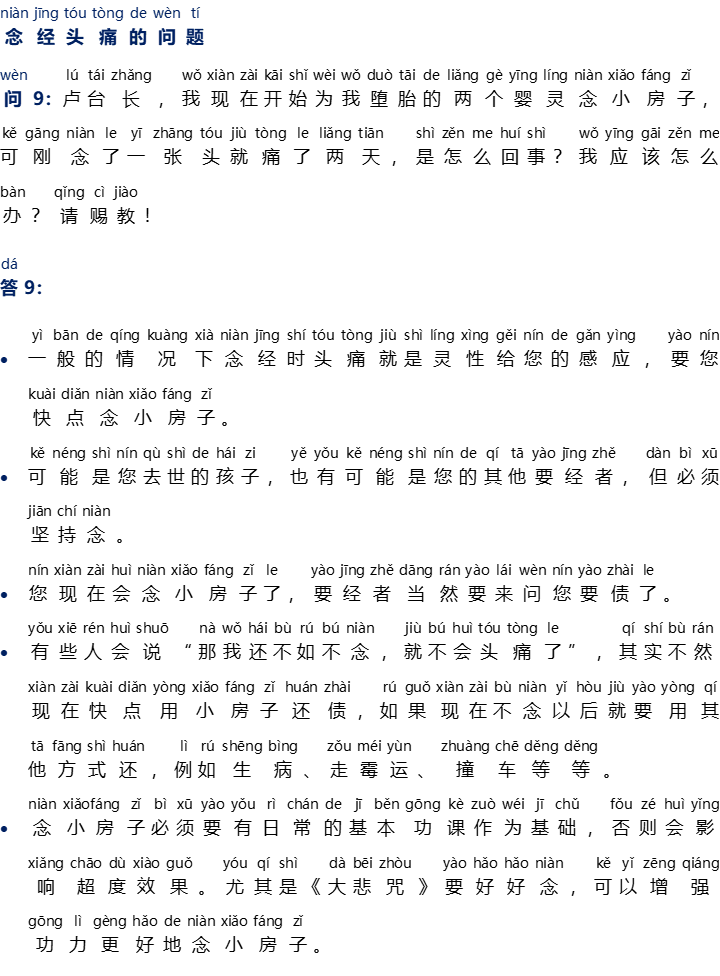 - Beberapa orang mungkin akan berkata: “Jika demikian, sebaiknya saya tidak melafalkan (Xiao Fang Zi) sehingga kepala saya tidak sakit lagi.”, sebenarnya pemikiran ini tidak benar, sekarang kita masih bisa menggunakan Xiao Fang Zi untuk segera melunasi hutang karma, jika tidak dilafalkan sekarang, mungkin Anda harus melunasi hutang karma Anda dalam bentuk yang lain di kemudian hari, seperti sakit, tertimpa kesialan, kecelakaan mobil, dan lain-lain.