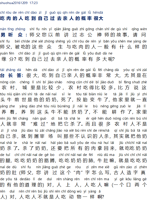 Master menjawab: Sangat besar, kemungkinan termakan kerabatnya sendiri sangatlah besar, terutama di daerah perdesaan, di daerah perkotaan lebih sedikit namun di daerah perdesaan lebih banyak. Misalnya, sapi ini adalah neneknya dimasa lampau, ketika meninggal lalu dilahirkan kembali menjadi sapi. Dan dia terus memeliharanya sampai suatu ketika sapi tersebut tidak bisa lagi diperah susunya dan tidak dapat membajak sawah, maka mereka akan membunuhnya dengan penuh kesedihan. Tetapi banyak orang desa tidak membunuhnya sendiri, namun mereka pergi ke rumah jagal dan menyuruh orang yang tidak dikenal untuk membunuhnya, dengan kata lain yaitu membunuh neneknya. Setelah neneknya dibunuh, masih membawa semua daging pulang ke rumah. Makan paha neneknya, makan lengan neneknya, makan paru-paru neneknya, babat yaitu sama artinya dengan makan lambung neneknya, begitulah (Master, Anda pernah berkata bagaimana cara penulisan huruf “Ròu 肉 (daging)”, orang kuno menciptakan huruf mempunyai maksud tersendiri) betul, (rén shàng rén 人 上 人 ) manusia diatas manusia, manusia memakan manusia (肉:satu mulut dua orang, yī gè kǒu liǎng gè rén 肉: 一个口两个人 ), terhadapmanusia memakan manusia bukankah sama dengan manusia memakan hewan?