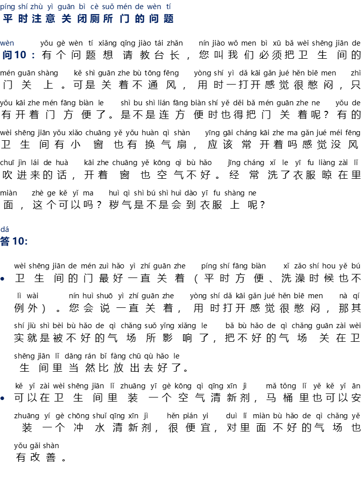 Tanya [10]: Master Lu mohon tanya, Anda meminta kami untuk menutup pintu kamar mandi setiap saat. Namun, jika pintu ditutup tidak ada sirkulasi udara, saat dibuka kamar mandi akan terasa pengap, saat terpaksa digunakan dengan membuka pintu. Apakah sewaktu digunakan pintu kamar mandi harus ditutup? Apakah jendela kecil dan kipas ventilasi di dalam kamar mandi harus sering dibuka? Jika tidak ada aliran udara, walaupun jendela sudah dibuka tetap terasa pengap. Saya sering menjemur baju di dalam kamar mandi, apakah boleh? Apakah energi negatif akan menempel pada baju?