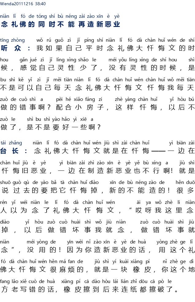 Master: Melafalkan Lǐ Fó Dà Chàn Huǐ Wén adalah pertobatan – Sembari bertobat karma buruk lama, juga jangan menciptakan karma buruk baru. Artinya harus bertobat kesalahan masa lalu, dan tidak ciptakan karma buruk baru!
