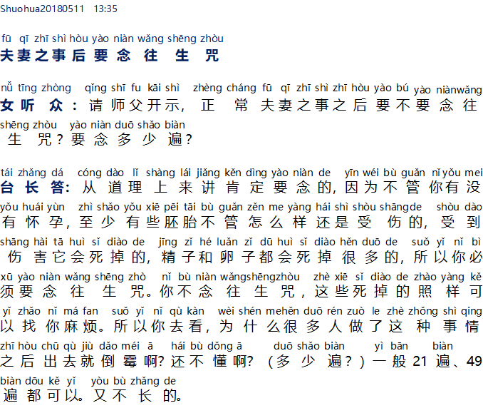 Setelah melakukan hubungan suami istri harus melafalkan mantra Wang Sheng Zhou 夫妻之事后要念往生咒