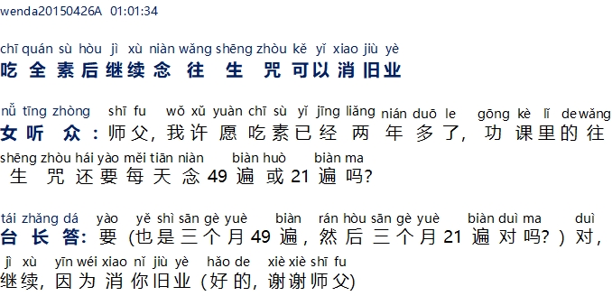 Pendengar wanita: Master, saya sudah berikrar vegetarian penuh selama lebih dari dua tahun, mantra Wang Sheng Zhou di dalam PR harian apakah setiap hari masih harus melafalkan 49 kali atau 21 kali?
