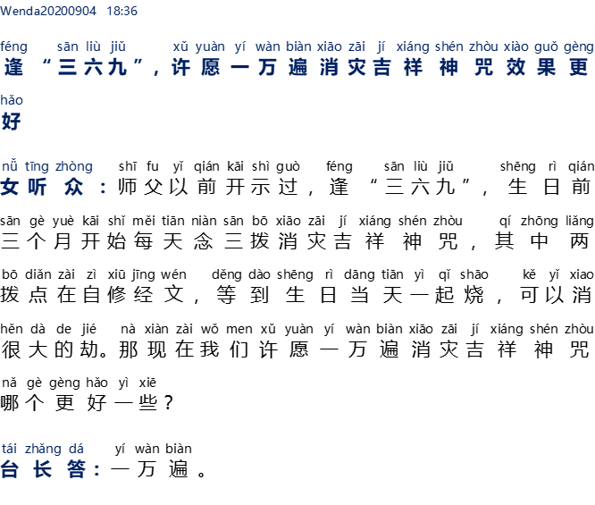 Wenda20200904   18:36 — Setiap halangan umur “3, 6, 9”; ikrar 10.000 kali paritta Xiao Zai Ji Xiang Shen Zhou hasilnya akan lebih baik