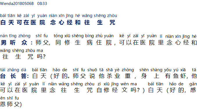Wenda20180506B   08:33 – Siang hari boleh melafalkan paritta Xin Jing dan Wang Sheng Zhou di rumah sakit