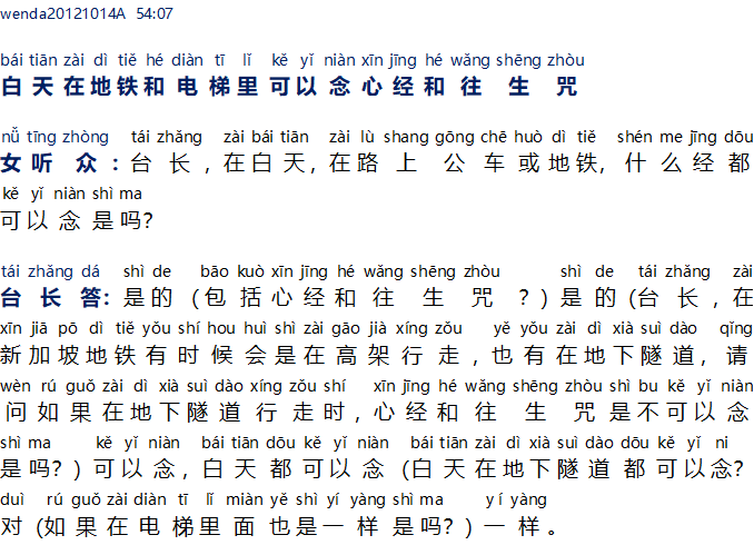Master menjawab : Ya (apakah termasuk paritta Xin Jing dan Wang Sheng Zhou?) Ya (Master, di Singapura MRT terkadang berjalan di rel layang, juga ada yang berjalan di terowongan bawah tanah. Mohon bertanya, jika kereta berjalan di terowongan bawah tanah, Xin Jing dan Wang Sheng Zhou tidak boleh dilafalkan ya?) Boleh melafalkan, siang hari boleh melafalkan semuanya (Boleh membaca semua paritta di terowongan bawah tanah pada siang hari?) Ya (jika berada di lift, juga sama ya?) Sama.