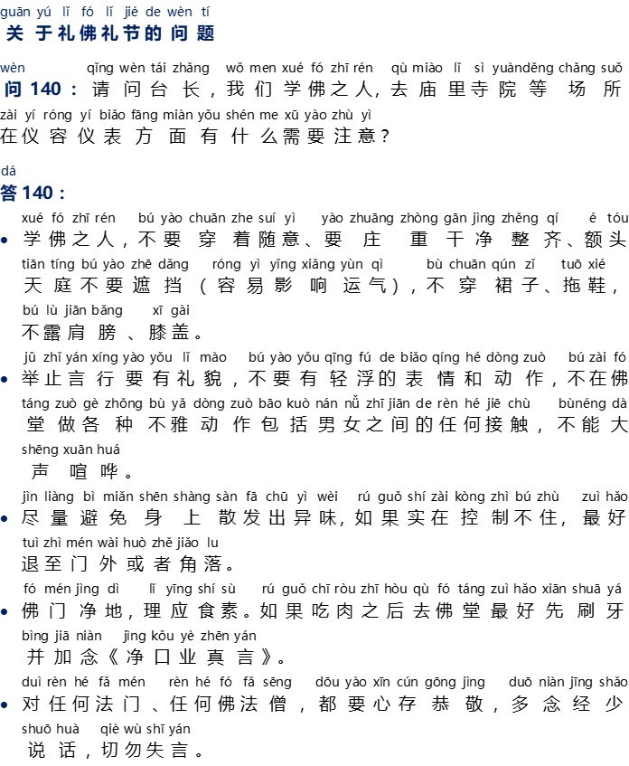 - Sebagai praktisi Buddhis, jangan berpakaian sembarangan, harus bersih dan rapih, rambut jangan menutupi dahi (akan mempengaruhi peruntungan), jangan memakai rok dan sandal, jangan (mengenakan baju) yang menampakkan bagian bahu dan lutut.