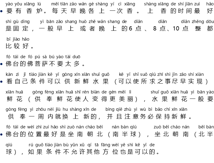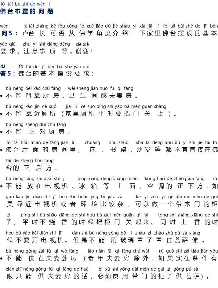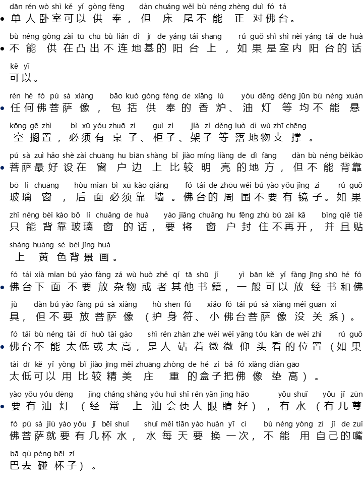 - Semua rupang atau gambar Buddha dan Bodhisattva, termasuk lampu minyak, tempat dupa, dan lain-lain tidak boleh ditempatkan dalam posisi menggantung, harus ada meja, lemari atau kerangka rak sebagai pijakannya, yang menjejak ke lantai.