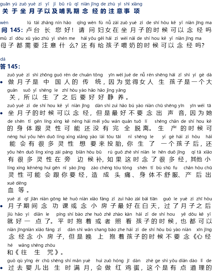 - Ketika menjalani masa nifas, sebaiknya melafalkan PR harian dan Xiao Fang Zi di pagi atau siang hari, setelah lewat masa ini, maka keadaan akan jauh lebih baik. Biasanya, pada saat menggendong atau menjaga bayi, tetap boleh melafalkan paritta dan Xiao Fang Zi, tetapi di malam hari saat menggendong bayi, jangan melafalkan {Xin Jing} dan {Wang Sheng Zhou}.