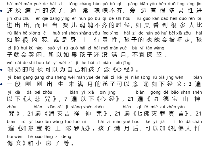 - Biasanya untuk anak bayi yang belum berusia satu bulan boleh melafalkan paritta berikut: {Da Bei Zhou} tidak lebih dari 3x, {Xin Jing} tidak lebih dari 7x, {Gong De Bao Shan Shen Zhou} 21x, {Xiao Zai Ji Xiang Shen Zhou} 21x, {Qi Fo Mie Zui Zhen Yan} 21x, {Ru Yi Bao Lun Wang Tuo Luo Ni} 21x. Setelah anak bayi genap berusia satu bulan, boleh ditambah dengan melafalkan {Li Fo Da Chan Hui Wen} dan Xiao Fang Zi.